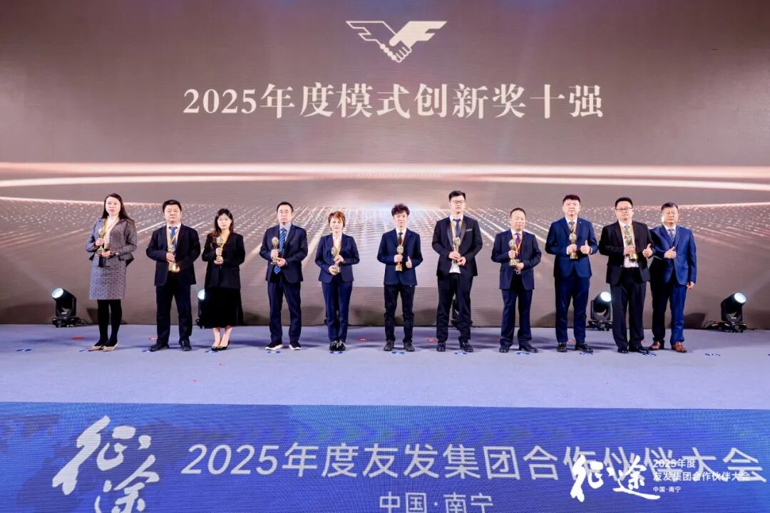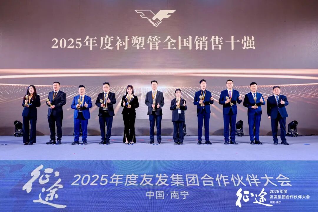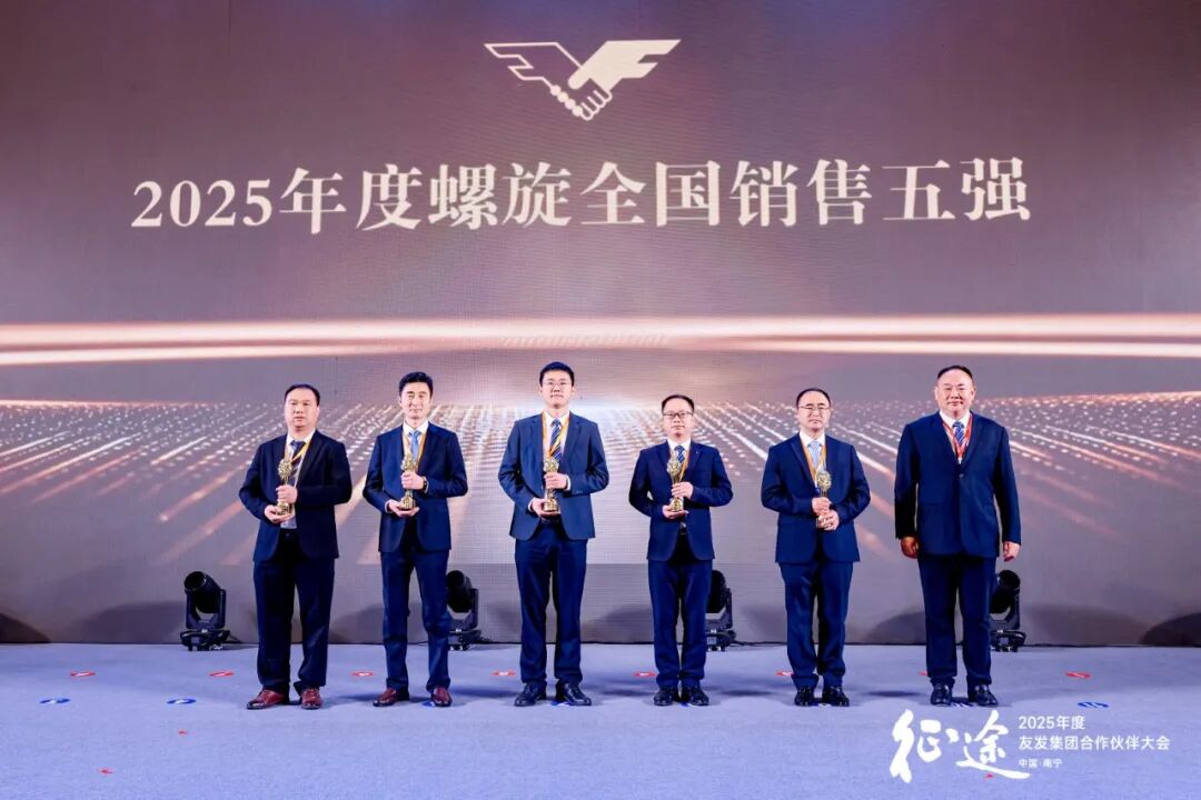 友发集团 总经理 陈广岭 随后,在友发集团党委书记金东虎主持下, 2025年度友发集团合作伙伴颁奖典礼在一片热烈的氛围中拉开帷幕。经过友发集团营销系统按年初制定的标准严格评审,最终75个单位脱颖而出,斩获111个奖项。在璀璨的灯光与热烈的掌声中,获奖合作伙伴代表依次登台领奖,友发集团高管团队为其颁发荣誉奖杯。一张张笑脸见证着合作的硕果,也传递着友发 “共赢互利、合作进取” 的企业文化内核。