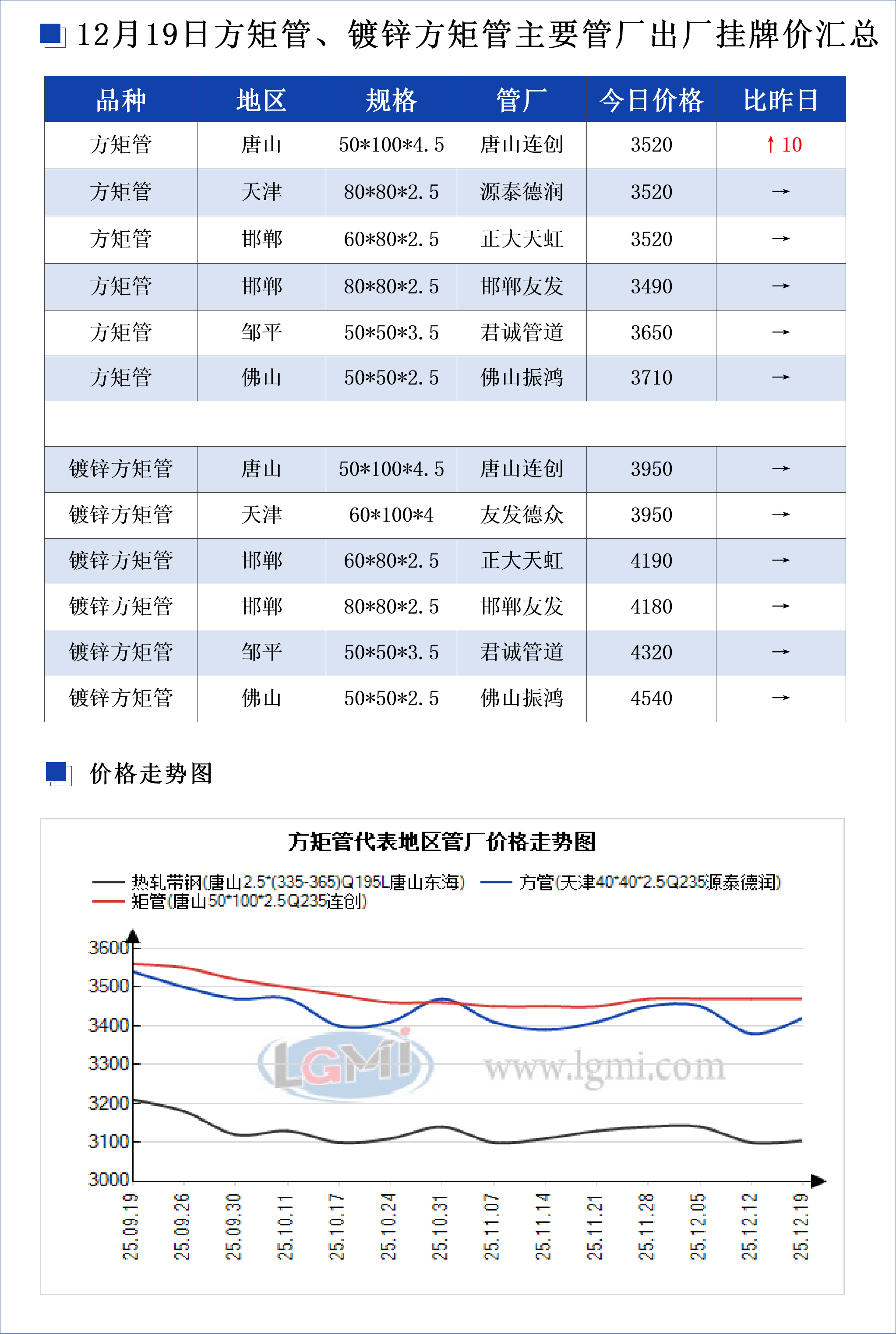 • 12月19日方矩管、镀锌方矩管主要管厂出厂挂牌价汇总