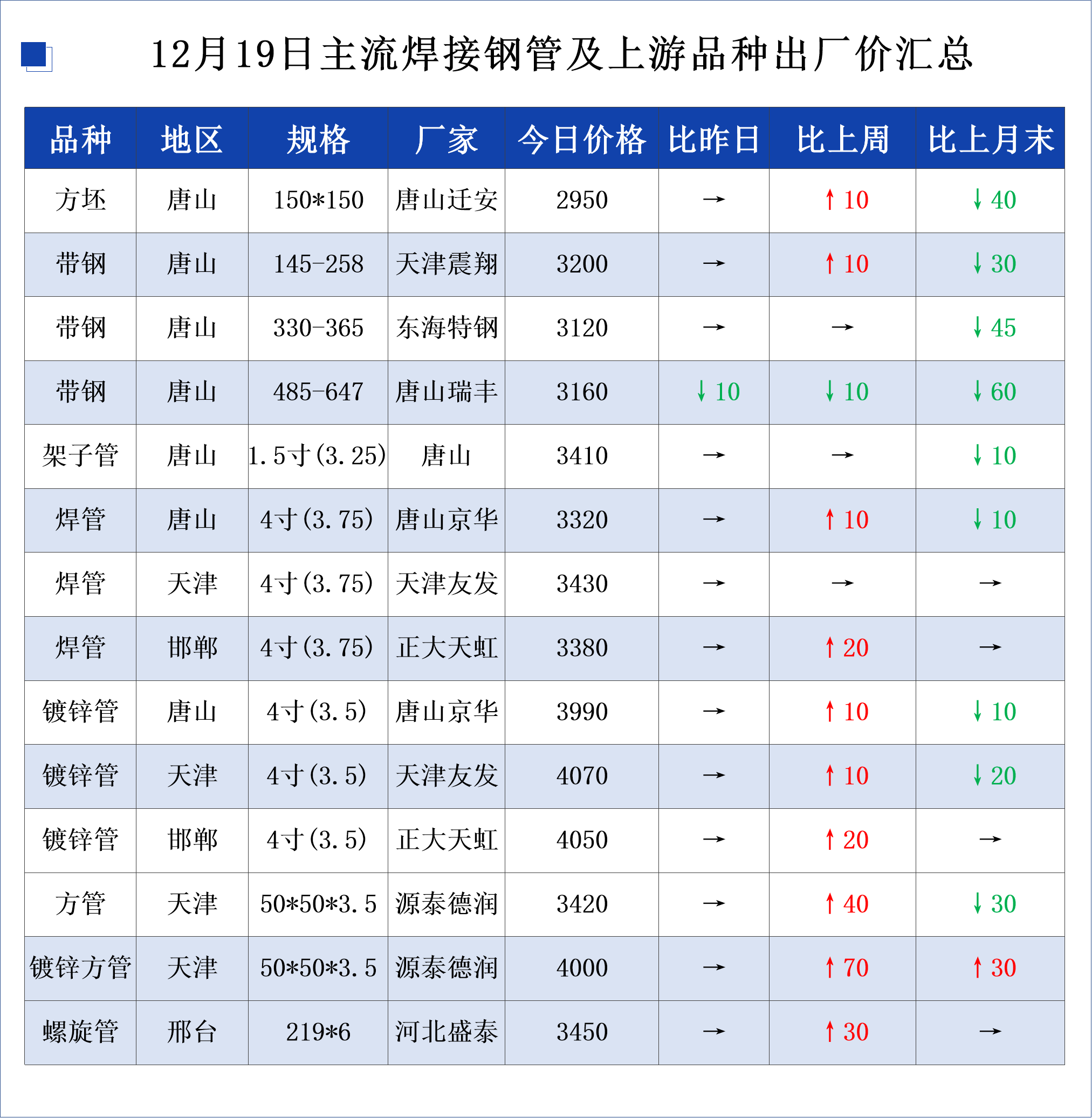 • 12月19日主流焊接钢管及上游品种出厂价格汇总