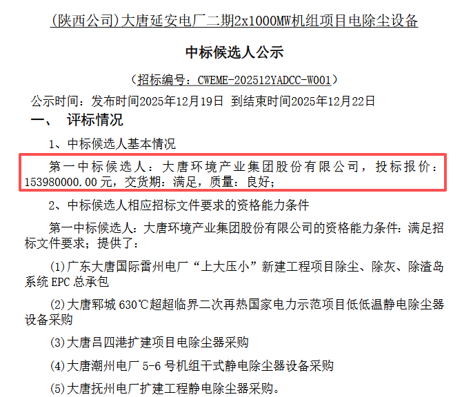 12月19日,大唐延安电厂二期2x1000MW机组项目电除尘设备中标候选人公示。大唐环境产业集团股份有限公司预中标,投标报价:153980000.00元。
