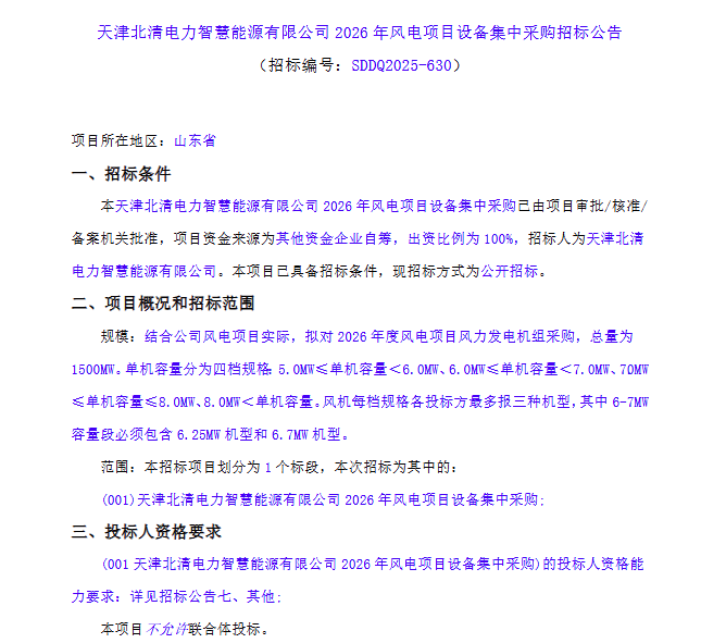 12月23日,中国招标投标公共服务平台发布《天津北清电力智慧能源有限公司2026年风电项目设备集中采购招标公告》。