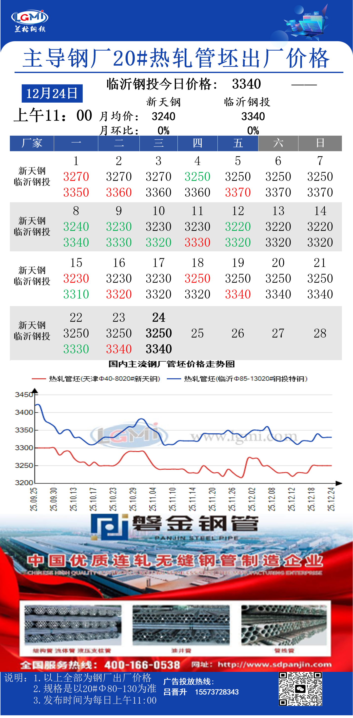 12月24日(11:00)主导钢厂20#热轧管坯出厂价