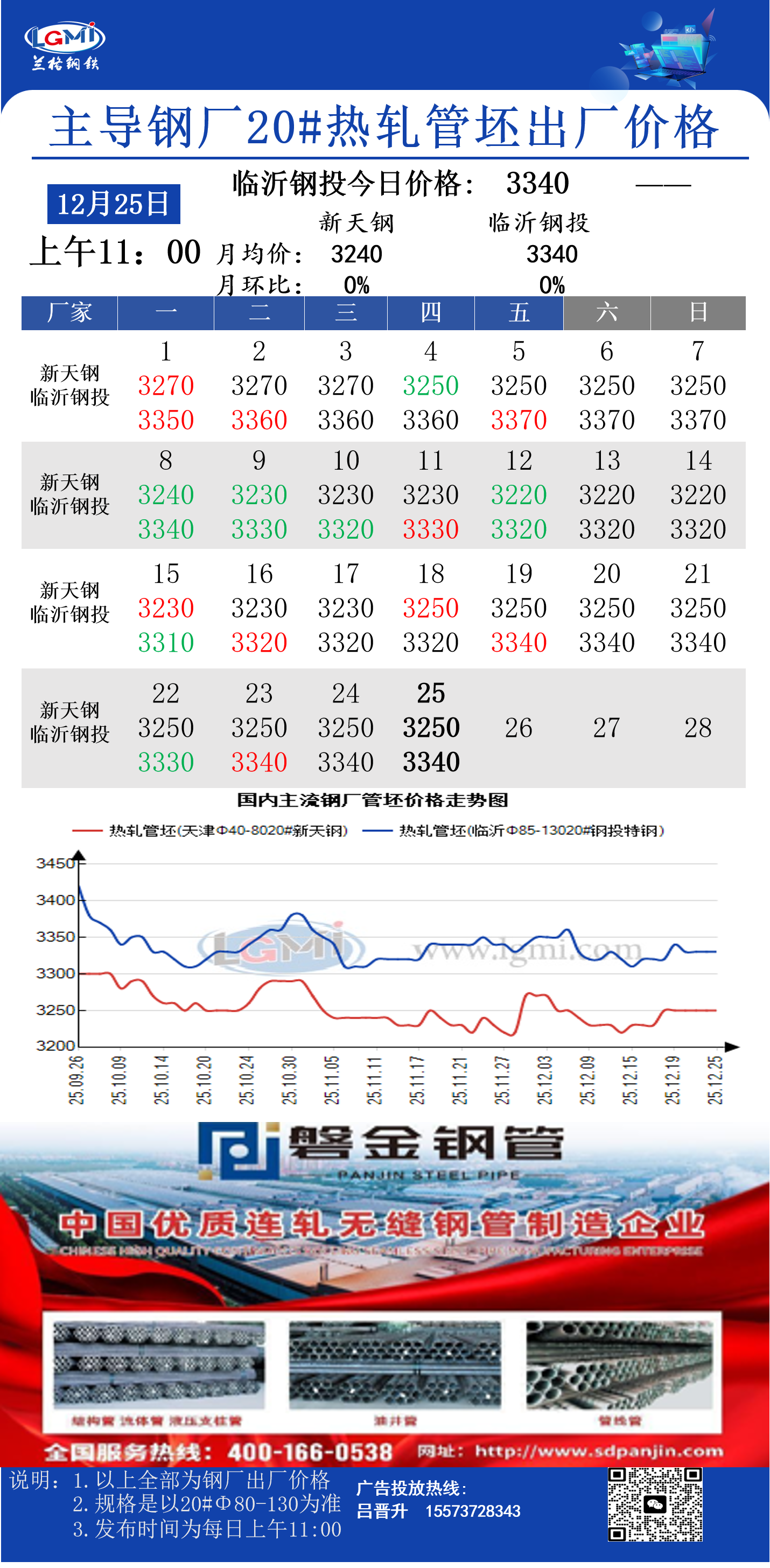 12月25日(11:00)主导钢厂20#热轧管坯出厂价