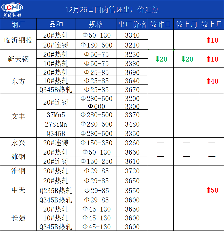 • 12月26日(11:00)主导钢厂20#热轧管坯出厂价