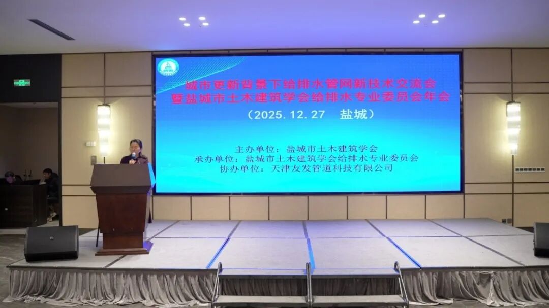 在城市更新持续深化的时代背景下,为助力建筑给排水领域的技术创新与行业协同,2025年12月27日,由盐城市土木建筑学会主办、盐城市土木建筑学会给排水专业委员会承办的“2025年给水排水学术交流年会” 在盐城金陵大饭店隆重召开。天津友发管道科技有限公司作为重要赞助方应邀参会,通过专属展位展示核心技术成果,并由销售部长尹青腾带来专业技术分享,与行业同仁共探城市水系统高质量发展之路。