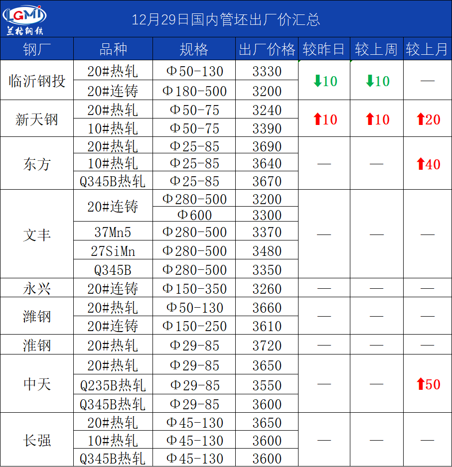 • 12月29日(11:00)主导钢厂20#热轧管坯出厂价