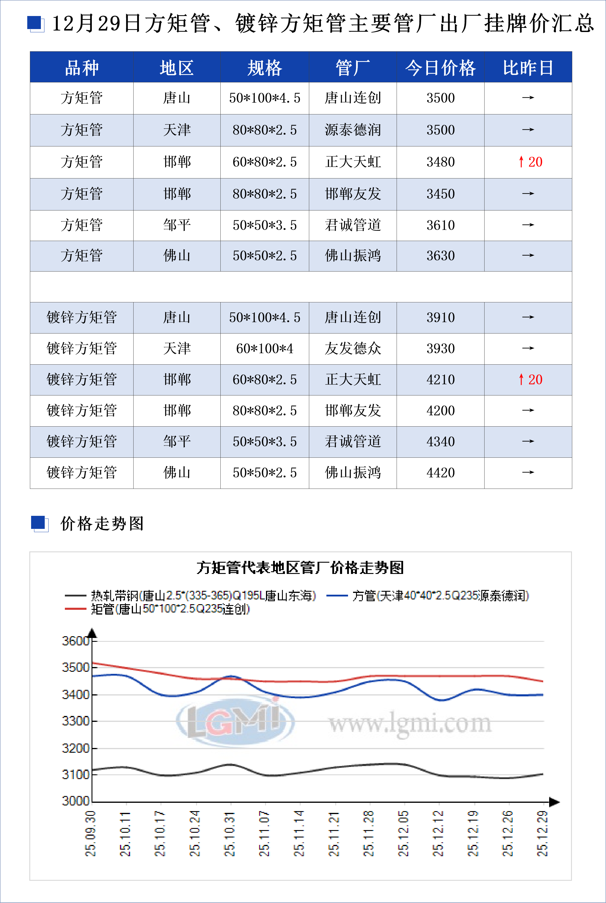 • 12月29日方矩管、镀锌方矩管主要管厂出厂挂牌价汇总