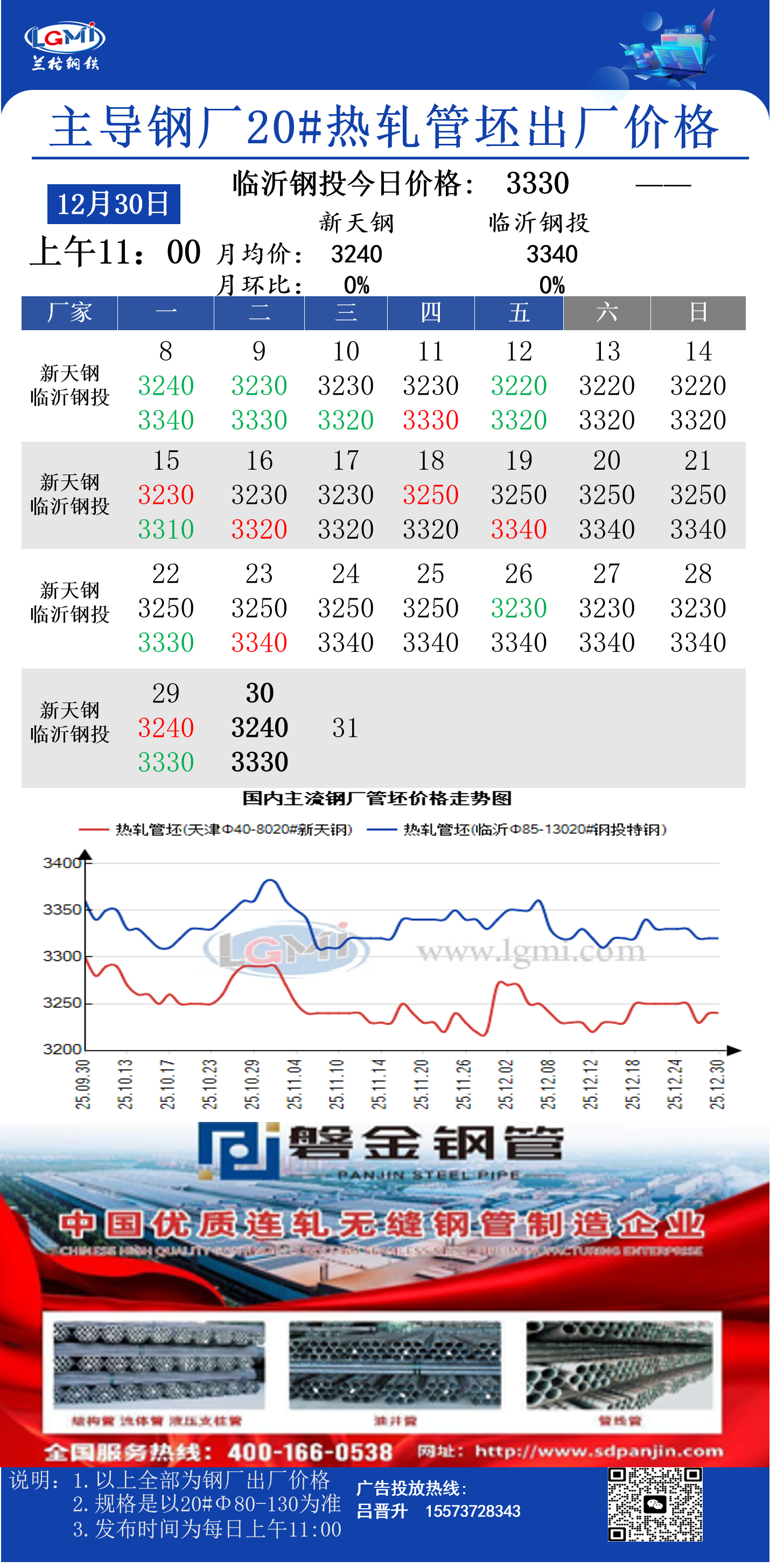 • 12月30日(11:00)主导钢厂20#热轧管坯出厂价