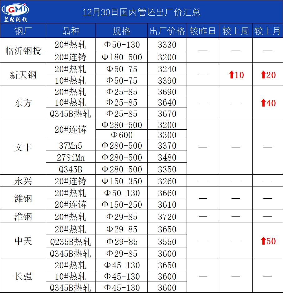 • 12月30日(11:00)主导钢厂20#热轧管坯出厂价