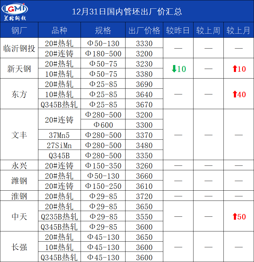 • 12月31日(11:00)主导钢厂20#热轧管坯出厂价
