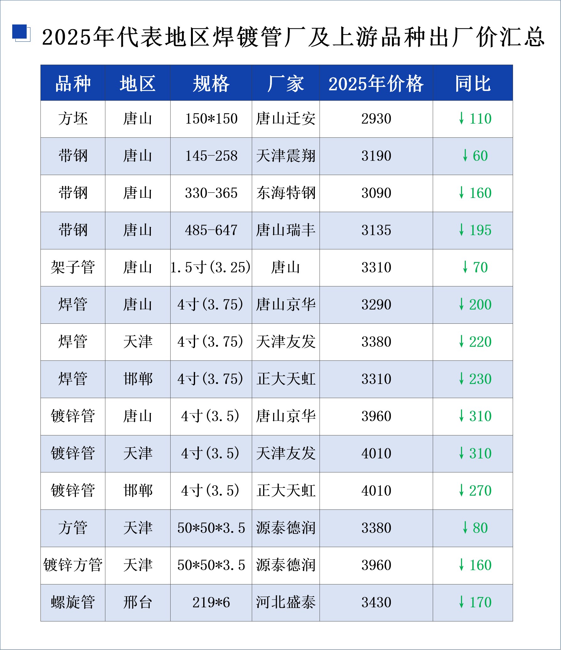 • 2025年国内代表地区焊镀管管厂及上游品种出厂价格汇总