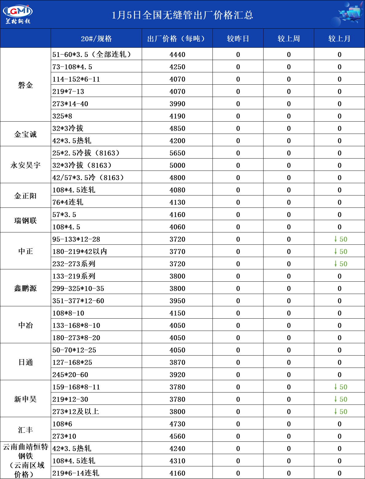 1月5日全国无缝管出厂价格汇总