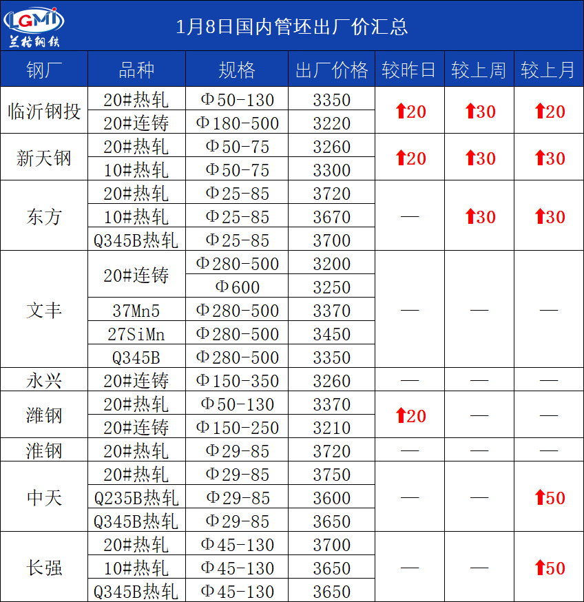 • 1月8日(11:00)主导钢厂20#热轧管坯出厂价
