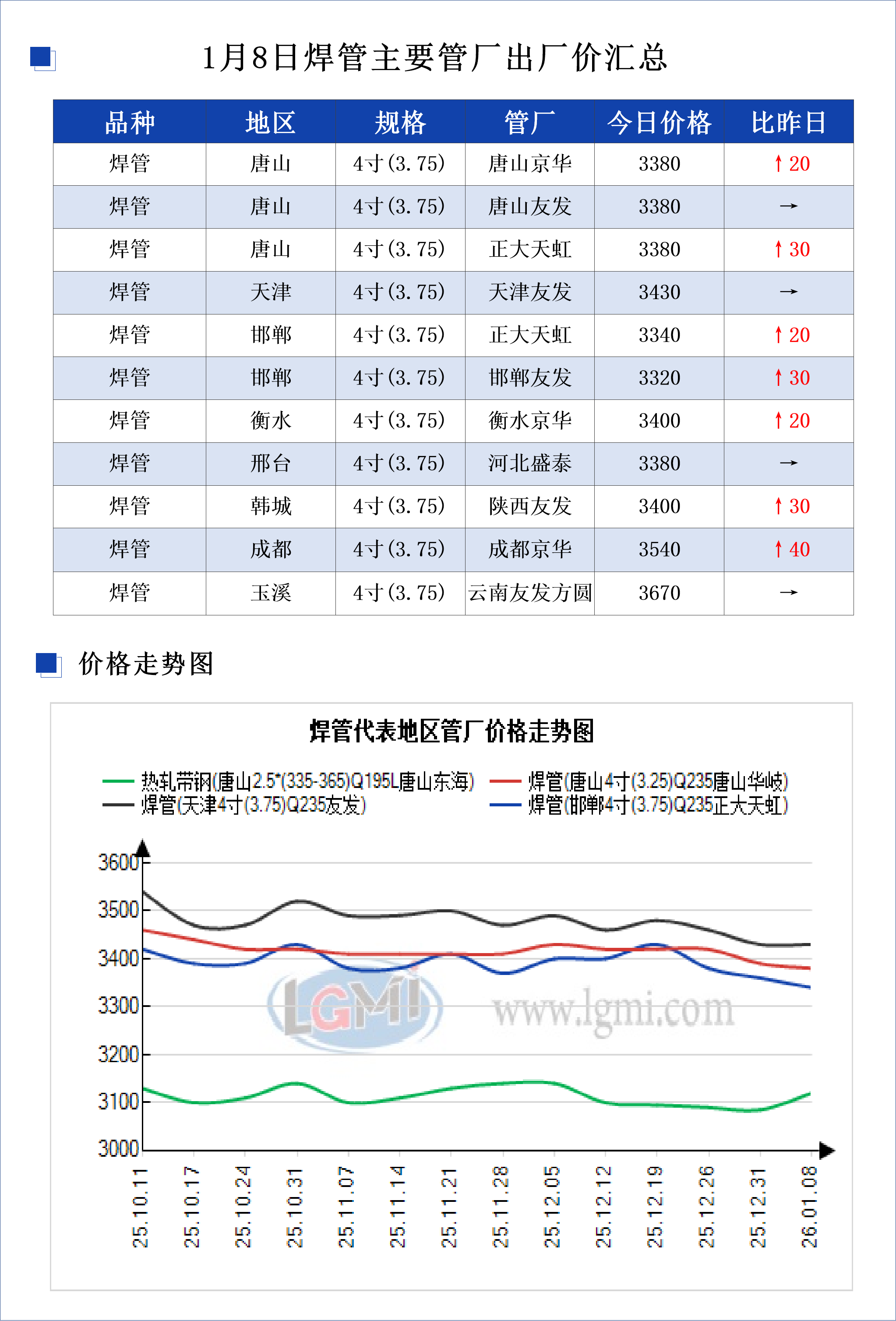 • 1月8日天津友发钢管集团股份有限公司第一分公司出厂价上调30元
