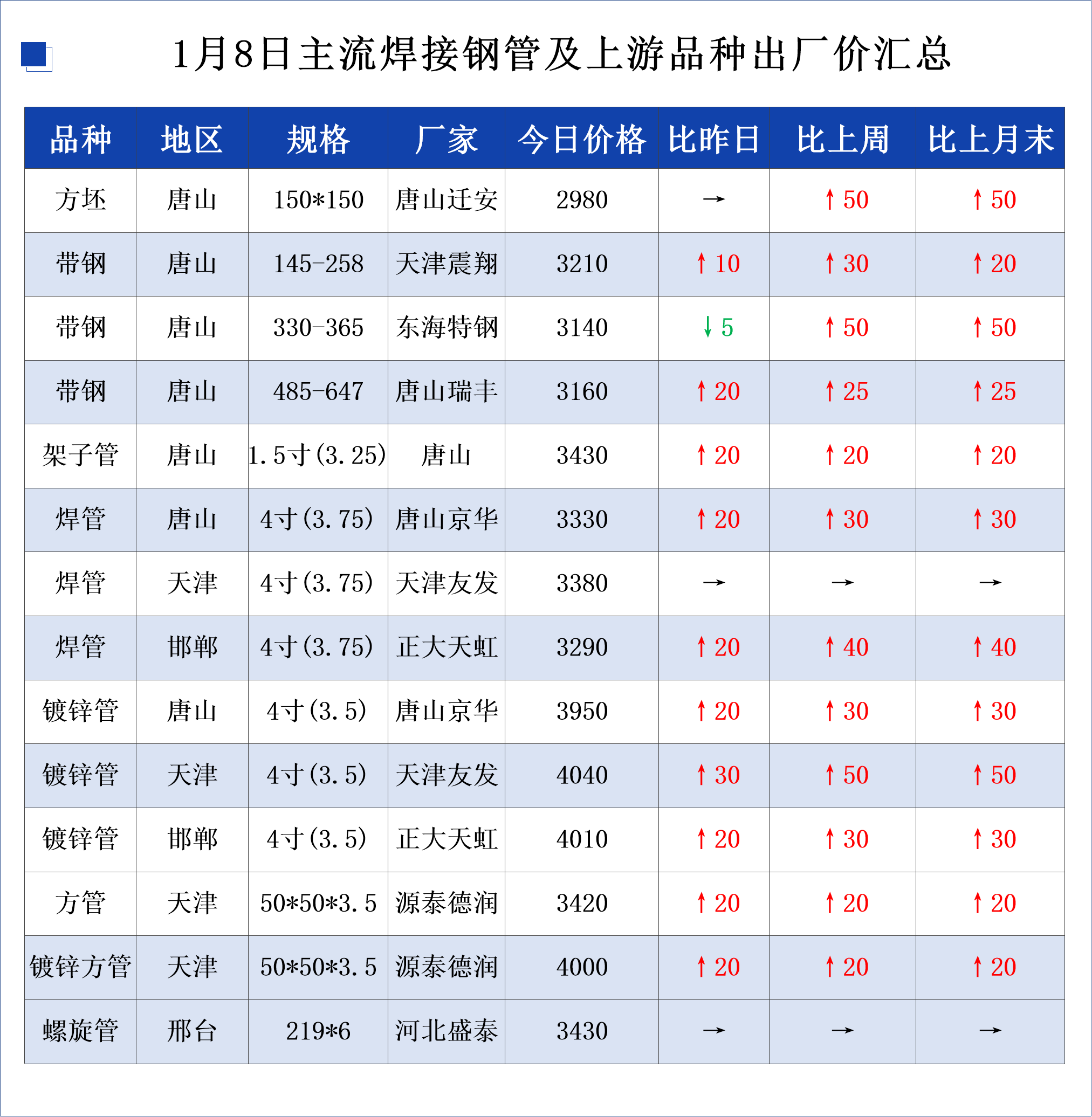 • 1月8日天津友发钢管集团股份有限公司第一分公司出厂价上调30元