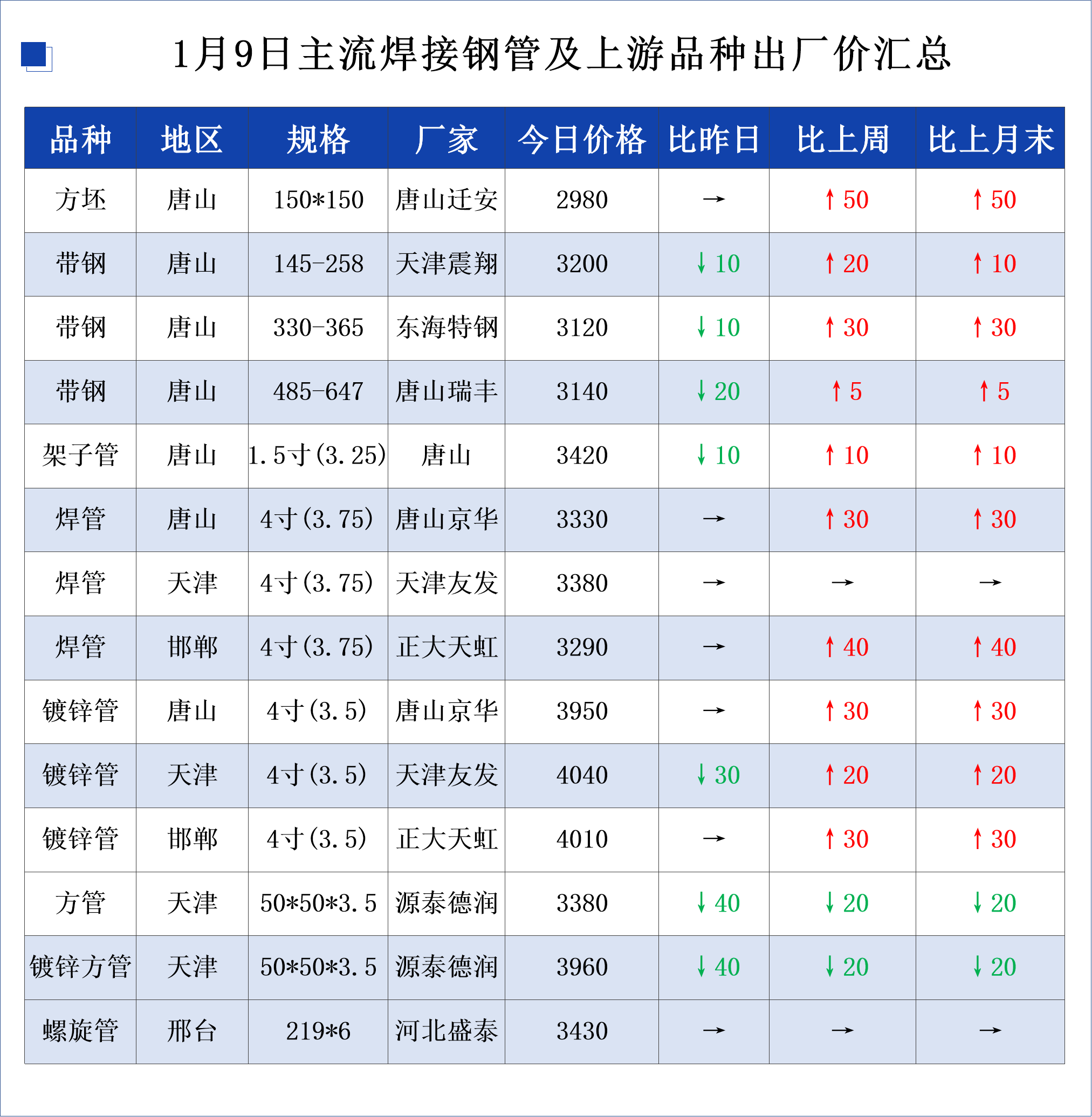 • 1月9日主流焊接钢管及上游品种出厂价格汇总