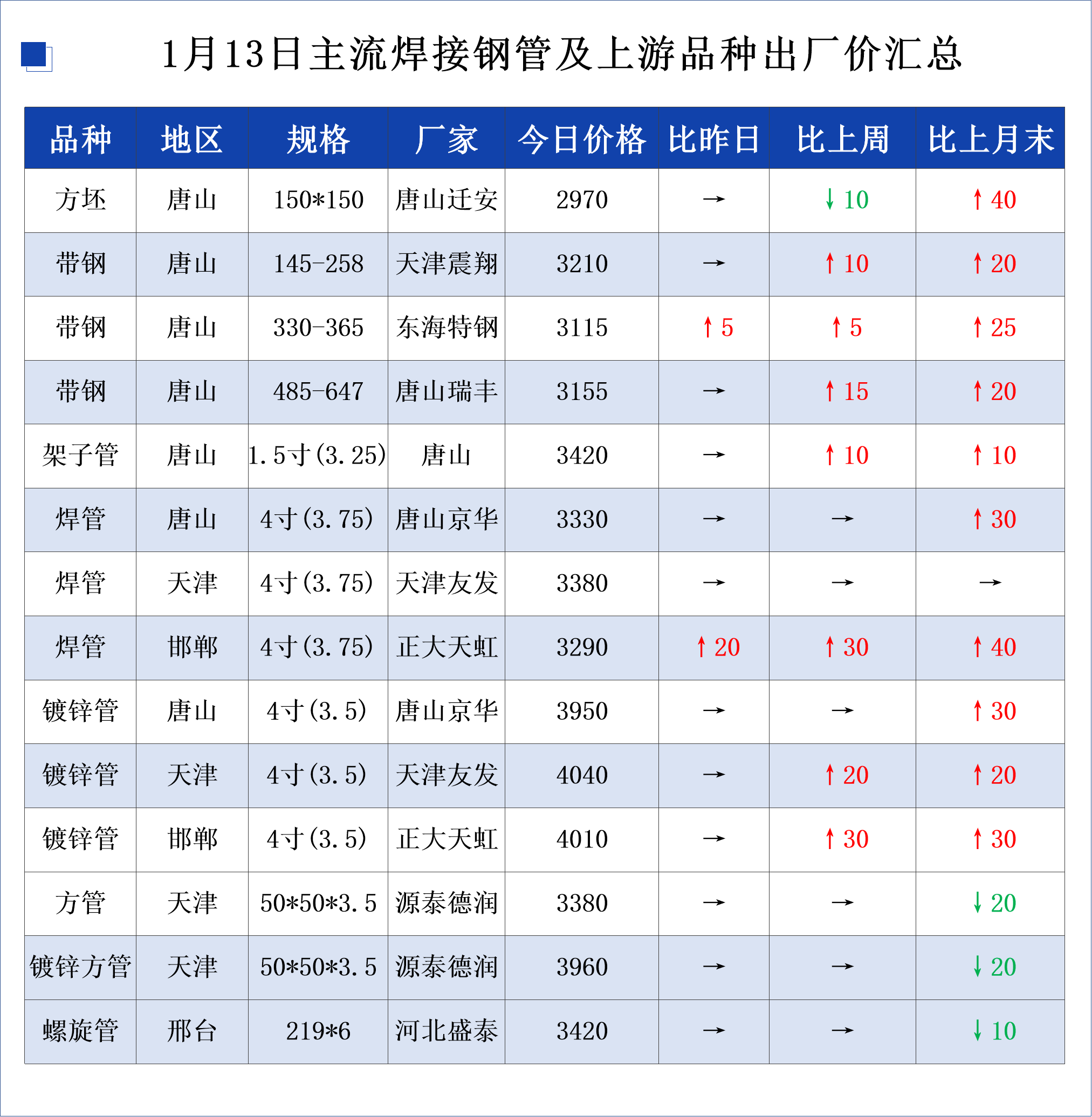 • 1月13日主流焊接钢管及上游品种出厂价格汇总