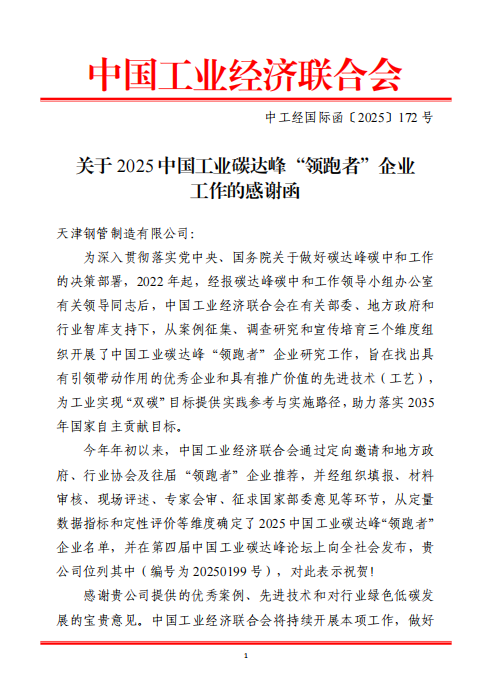 近日,中国工业经济联合会第四届中国工业碳达峰论坛在山东青岛举行,天津钢管荣获中国工业碳达峰“领跑者”企业,这一荣誉不仅是对企业绿色发展成果的权威认可,更凸显出其在长流程钢铁行业低碳转型进程中的标杆引领价值。
