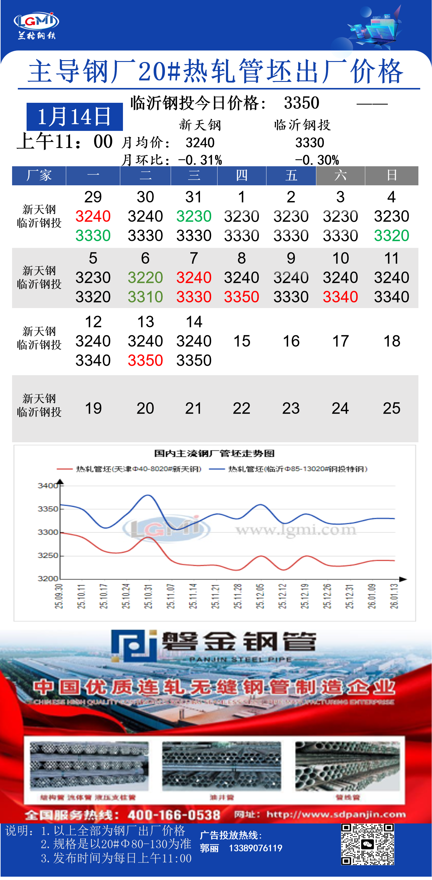 • 1月14日(11:00)主导钢厂20#热轧管坯出厂价