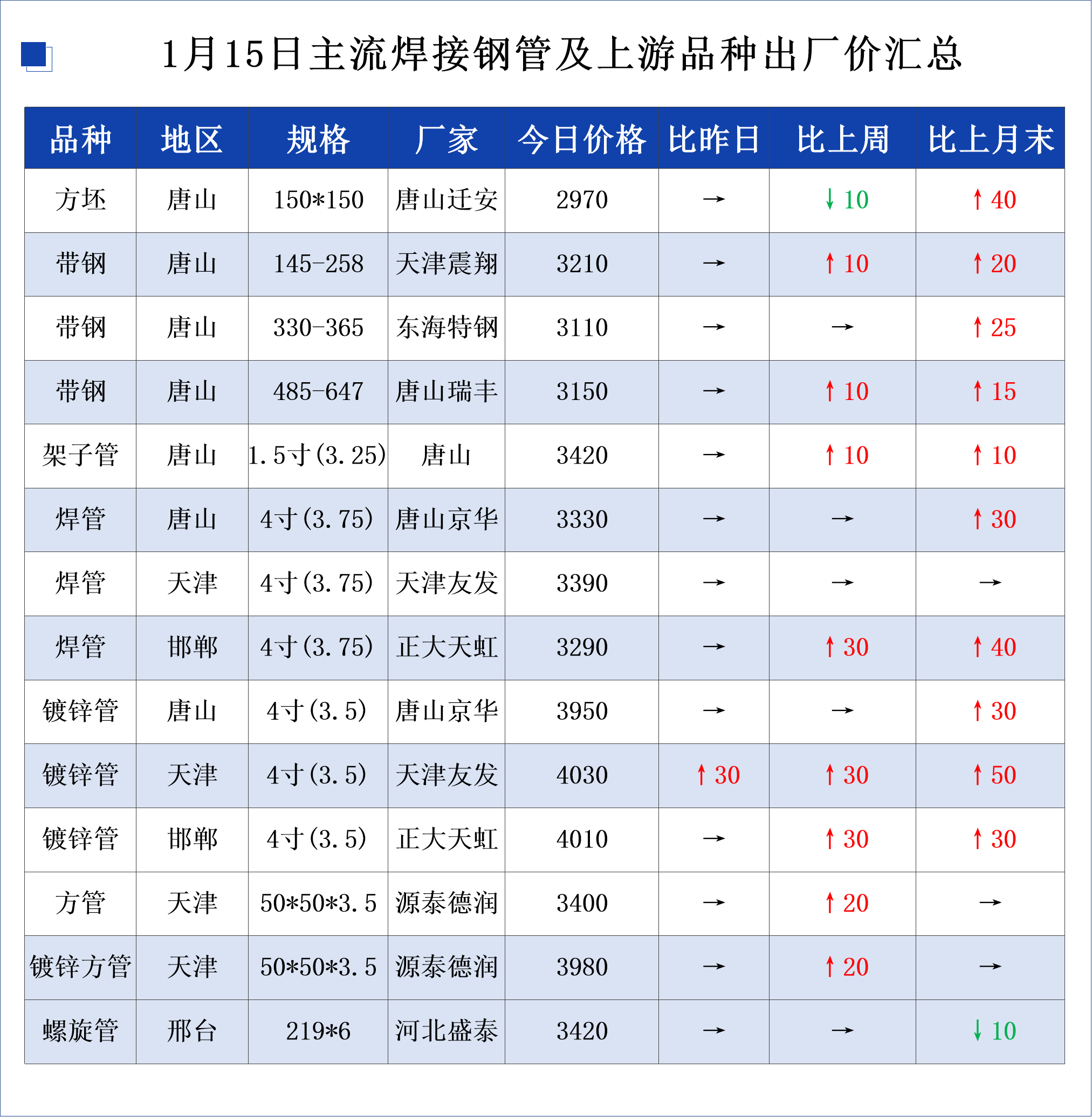 • 1月15日主流焊接钢管及上游品种出厂价格汇总