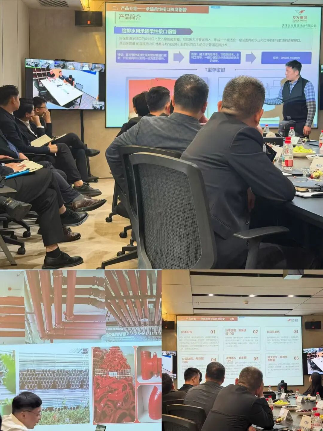 汉鑫集团总裁史诗鑫、副总裁张鸿鹏、产品总监骆春泽等核心管理层与友发管道科技来访团队就三大核心议题展开探讨: 1.聚力水务领域,共建高效服务 双方专项研讨“水务市场开拓”,着力打通项目落地、跨区域服务与技术协同,共同构建更贴近水务市政管道需求的 “产品+服务+技术”综合解决方案。 2.聚焦市政管道产品趋势探讨 双方聚焦市政管道材料、连接技术与系统解决方案等关键方向,共同探讨如何将前沿趋势转化为市场竞争力。推动合作从产品供应深化为价值共创的联合服务体,以共同响应市场需求。 3.市场推广协同,强化市场竞争力 围绕新产品市场推广,双方就跨区域协同达成共识,将合力打破壁垒,敏捷响应市场需求。同时,针对新产品安装技术难点,将提供专业安装指导与现场支持,确保从销售到解决方案的高质量交付,以此提升整体市场竞争力。 荣耀时刻:管件品类销售冠军颁奖仪式 友发管道科技有限公司总经理苏九川将奖品颁予汉鑫集团总裁史诗鑫,以表彰汉鑫在2025年度管件品类合作中卓越市场开拓能力与渠道贡献。