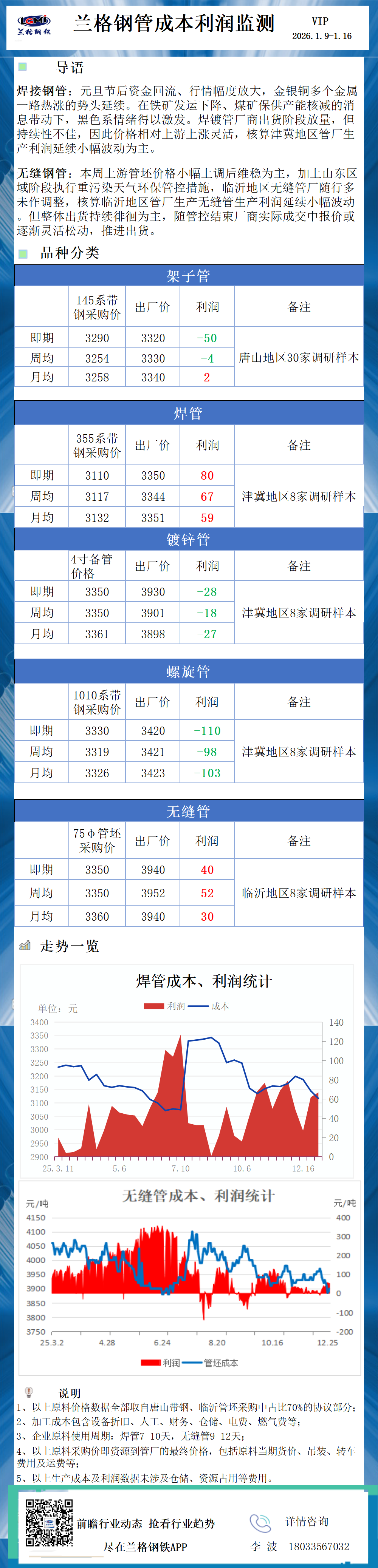 兰格调研:钢管成本利润监测(1月16日)