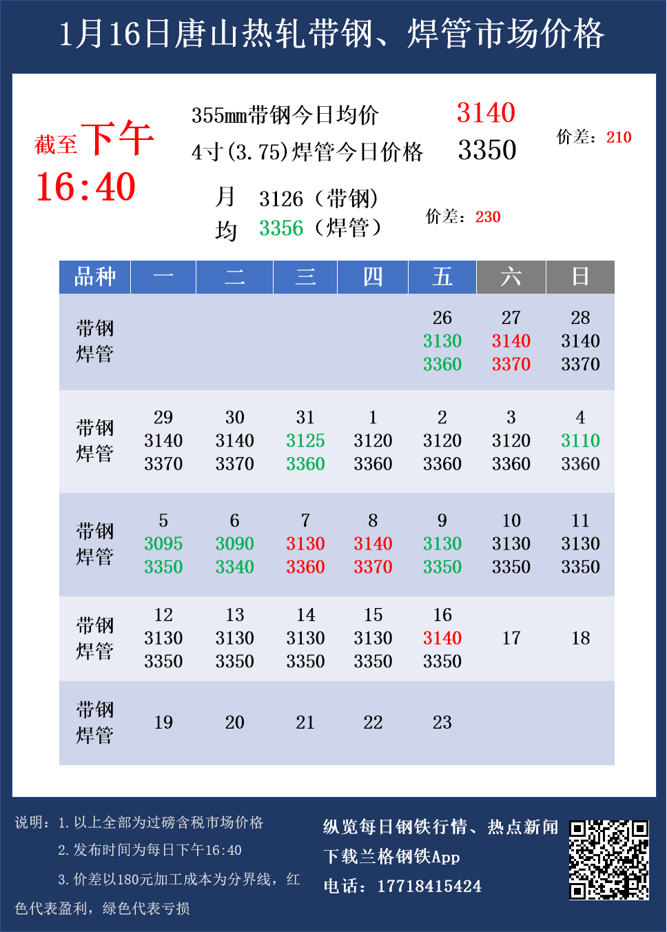 1月16日(16:40)唐山热轧带钢与焊管市场成交价格
