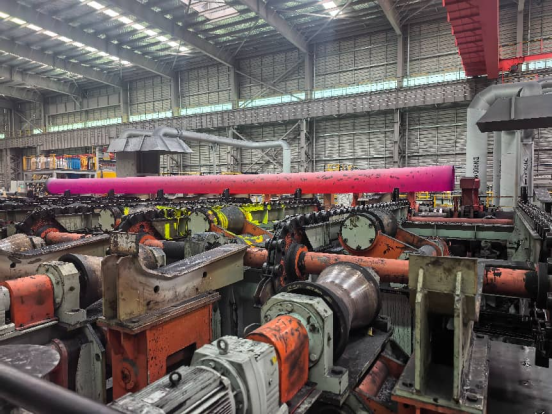本次试轧的φ480~508 系列热扩无缝管,展现出卓越的工艺稳定性与产品可控性,其中φ480*8和φ508*8 规格产品平均壁厚稳定控制在7.9~8.0mm,长度12米以上,外径尺寸精度与直线度完全符合设计标准,每一支钢管均经过辊式矫直工艺精准调校,后续漏磁探伤检测实现100%合格。物理性能表现优异,屈服强度、抗拉强度和伸长率等核心指标远超行业标准,充分验证了产线在大口径薄壁无缝管领域的制造能力。