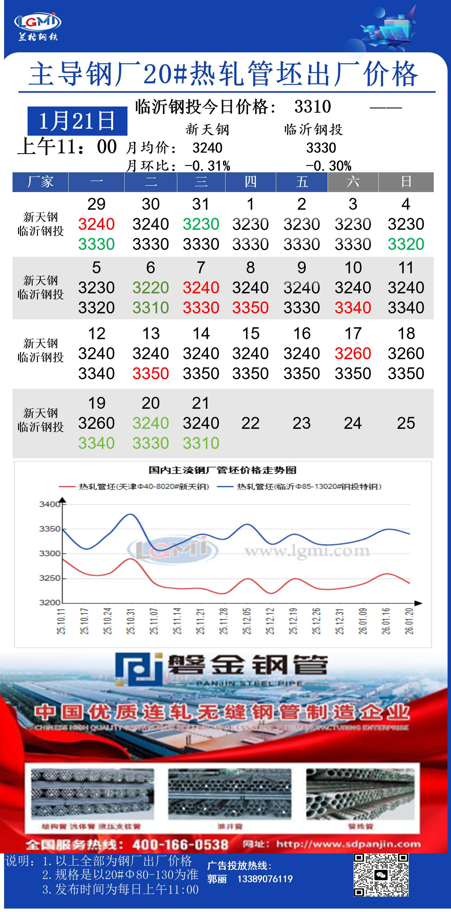 • 1月21日(11:00)主导钢厂20#热轧管坯出厂价