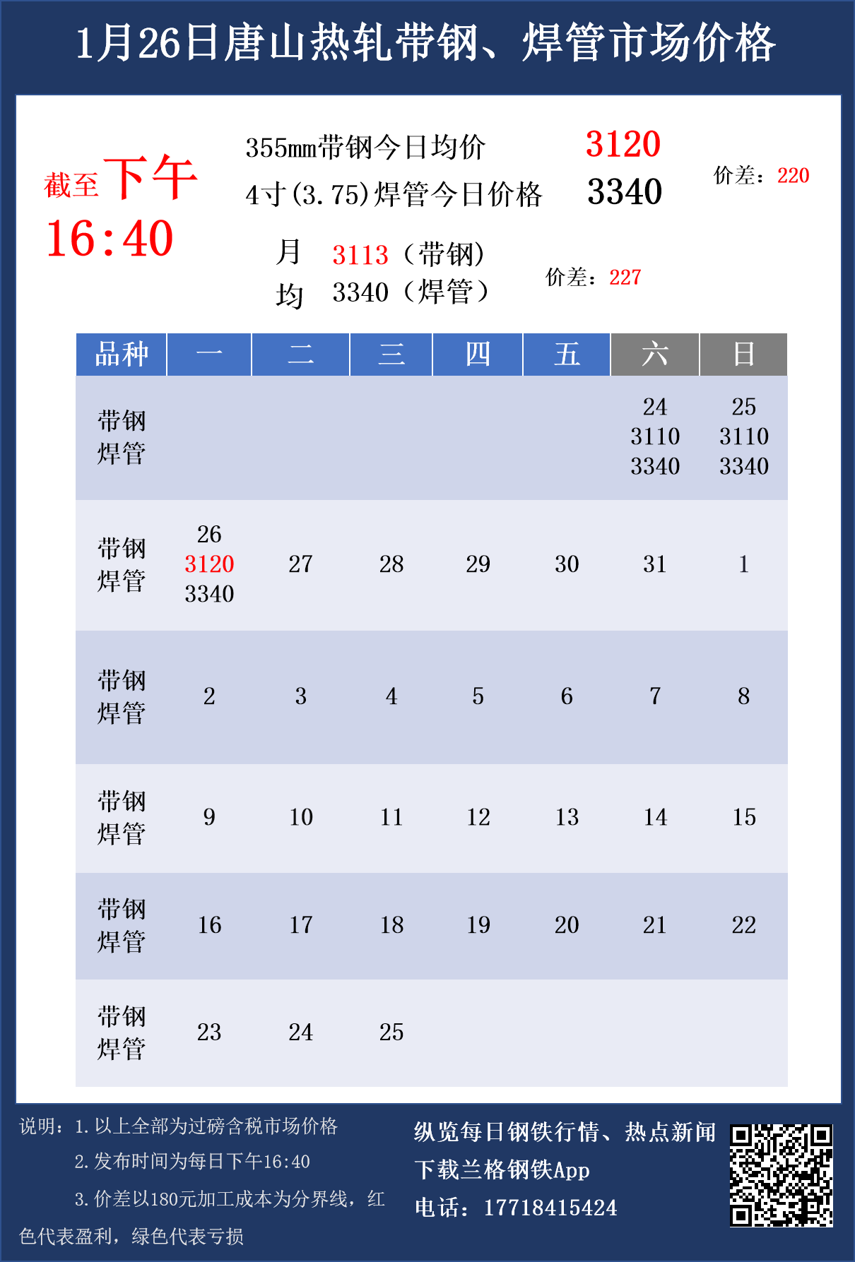 • 1月26日(16:40)唐山热轧带钢与焊管市场成交价格