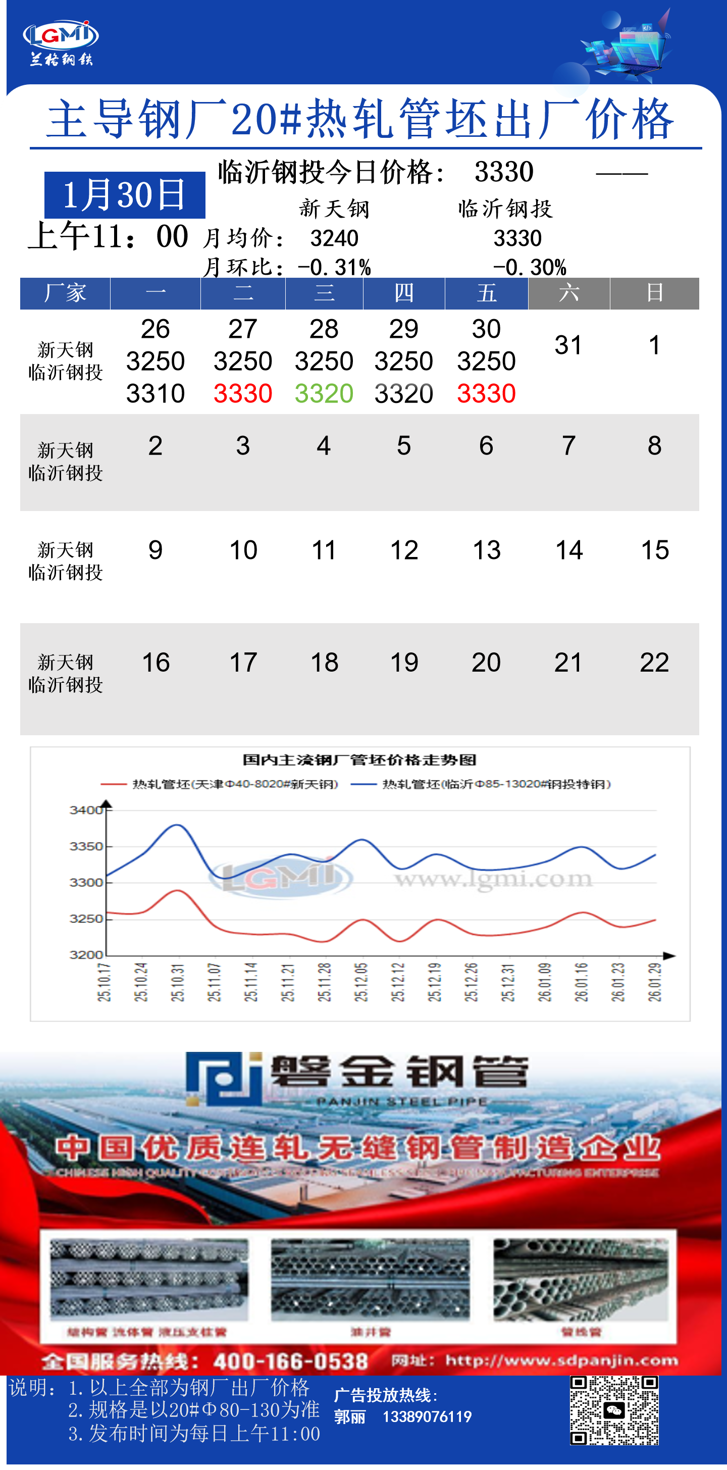 • 1月29日(11:00)主导钢厂20#热轧管坯出厂价