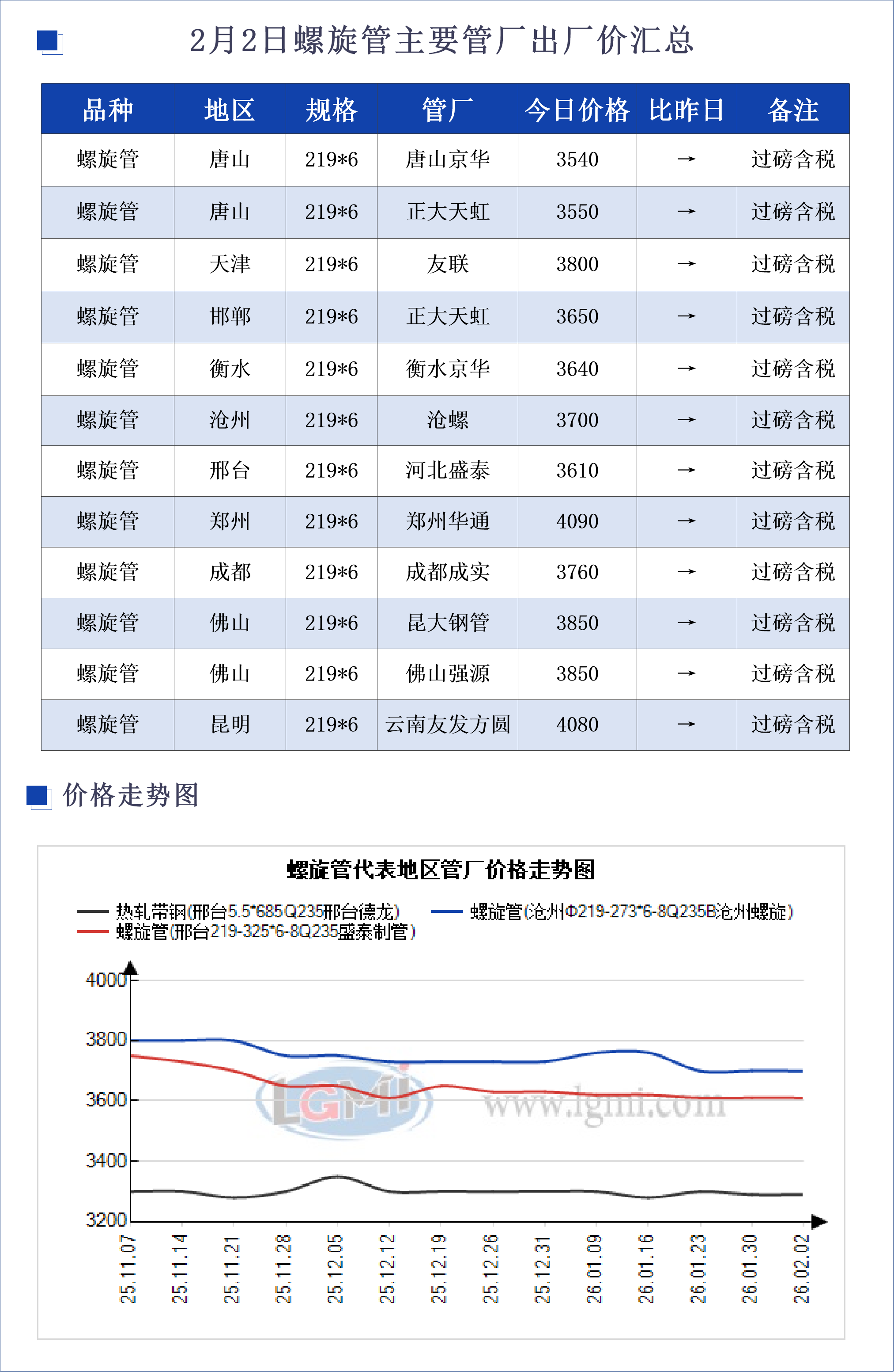 • 2月2日螺旋管主要地区管厂出厂价汇总