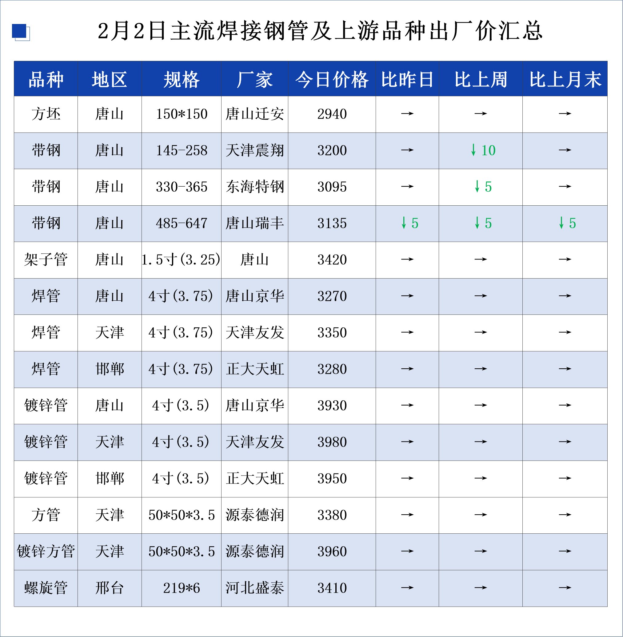 • 2月2日主流焊接钢管及上游品种出厂价格汇总
