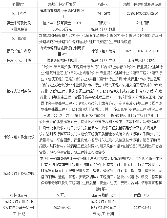 日前,辽宁海城市餐厨垃圾资源化利用项目EPC招标公告发布。