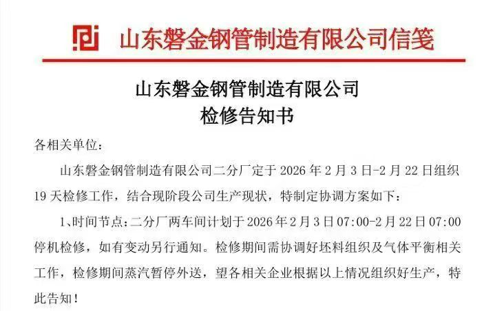 山东磐金钢管制造有限公司二分厂定于2026年2月3日-2月22日组织19天检修工作,结合现阶段公司生产现状,特制定协调方案如下: