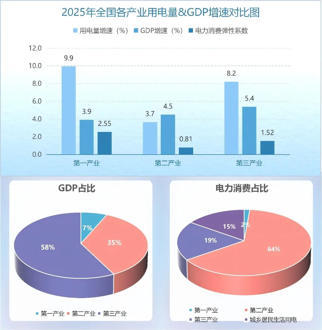 2025年,全国第一产业用电量增速稳居首位,电力消费弹性系数远大于1;第二产业用电量在整体电力消费中占比最高;第三产业GDP规模和GDP增速均居于三大产业首位;城乡居民生活用电量平稳增长。具体情况见下图。