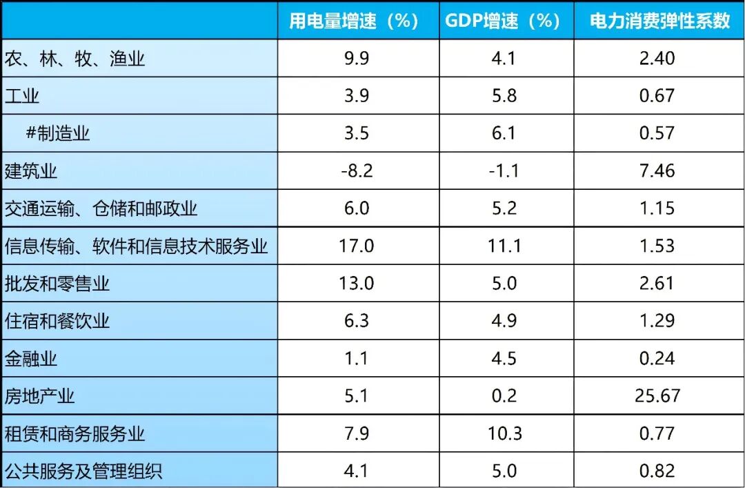 具体到各行业用电及GDP增速,请看下表: