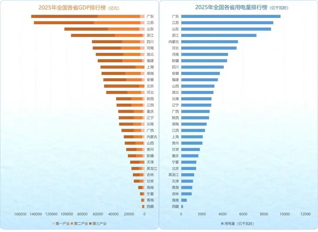 2025年,我国GDP达1401879亿元;全社会用电量累计103682亿千瓦时。从各省份的表现来看,GDP与用电量总量排名整体延续了此前的稳定格局,仅出现两处变动:重庆的GDP超越辽宁,广西的用电量反超陕西。广东、江苏、山东、浙江4个省份GDP和用电量稳居全国前四,西藏的GDP与用电量均处于全国末位。下图是2025年全国各省GDP和用电量排行榜: