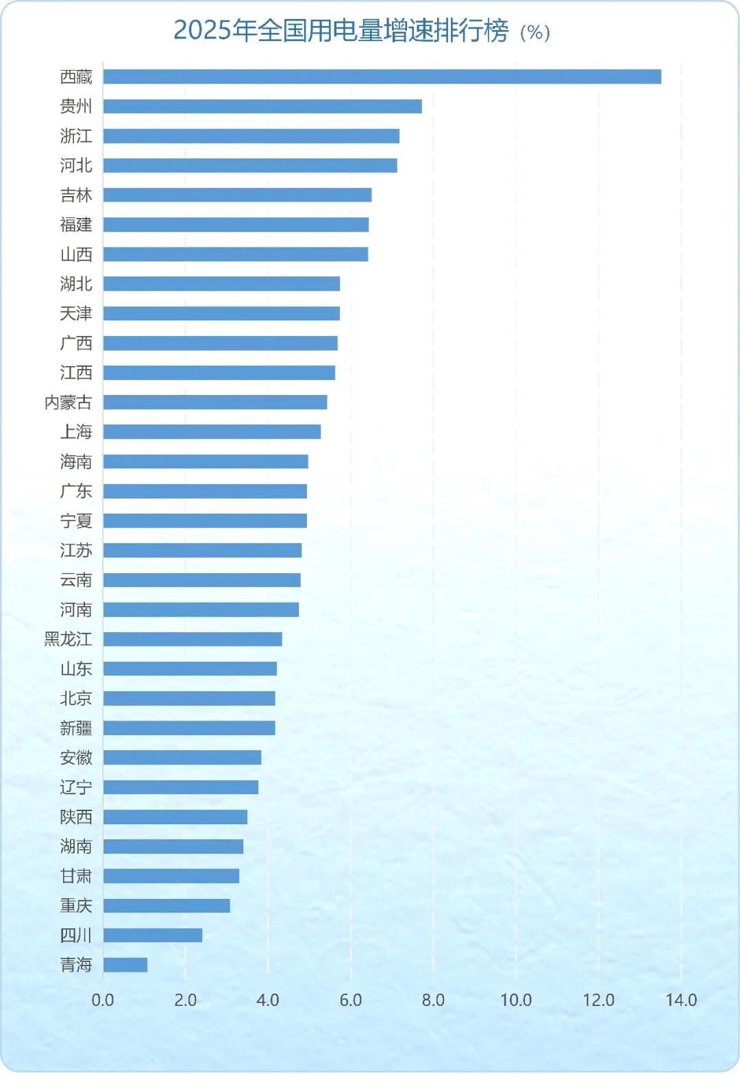 2025年,全国各省区全社会用电量均实现同比正增长。其中,西藏、贵州、浙江、河北、吉林、福建、山西、湖北、天津、广西、江西、内蒙古、上海13个省份用电量增速超过了全国增速(5.0%);海南全社会用电量增速与全国持平。各省全社会用电量增速排行如下: