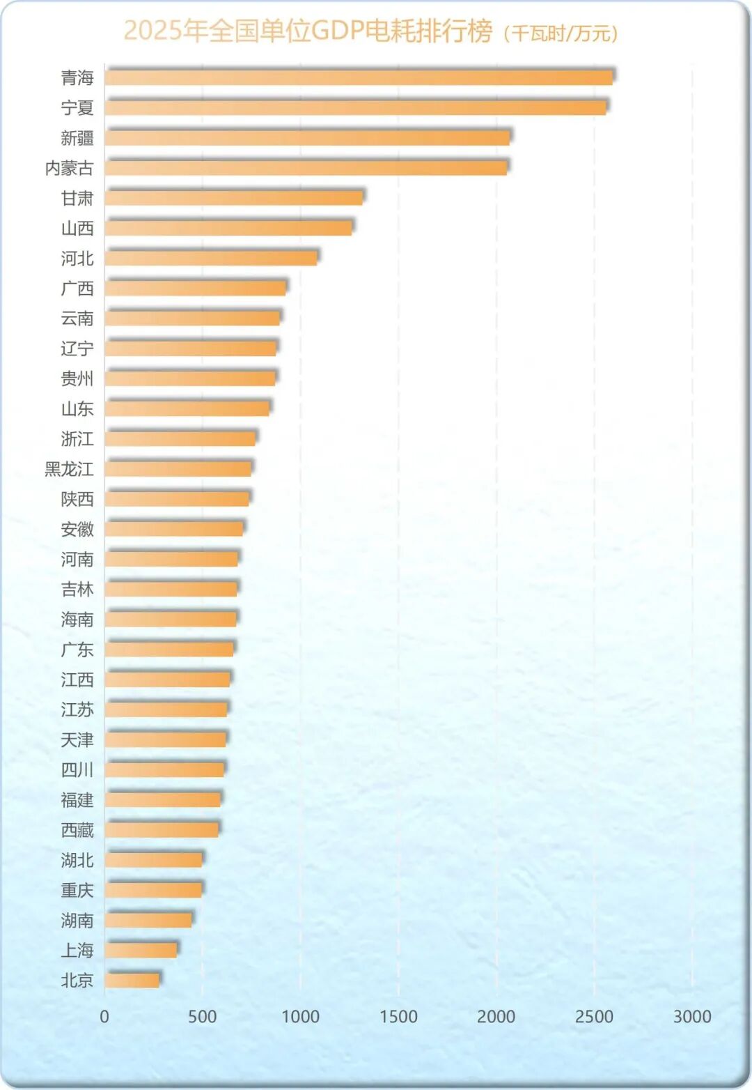 2025年,全国单位GDP电耗为739.59千瓦时/万元。北京、上海、湖南、重庆、湖北、西藏、福建、四川、天津、江苏、江西、广东、海南、吉林、河南、安徽、陕西17个省份的单位GDP电耗低于全国平均值。青海最高,达到2591.46千瓦时/万元。各省单位GDP的电耗排行如下: