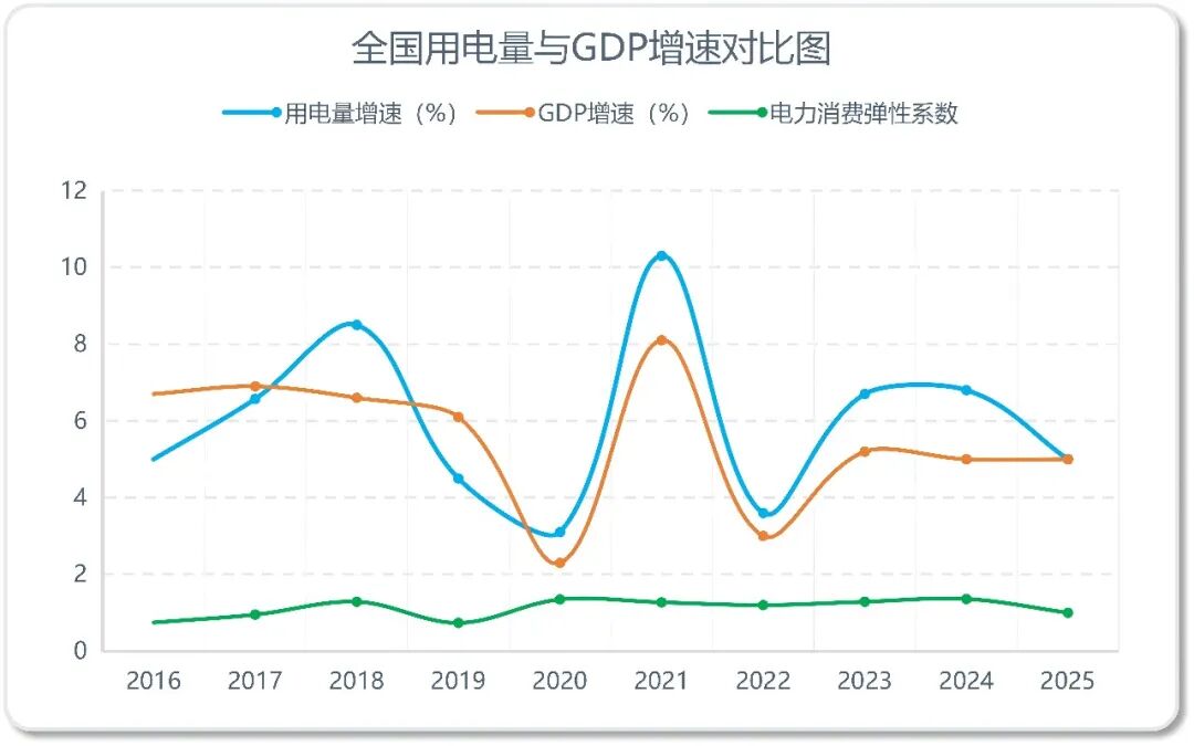 从长期增长态势来看,“十四五”期间全社会用电量年均增长率为6.6%,较“十三五”时期5.7%的年均增速提升0.9个百分点。下图是“十三五”以来全国用电量和GDP增速对比图,直观呈现出我国经济发展与电力消费的密切关系。
