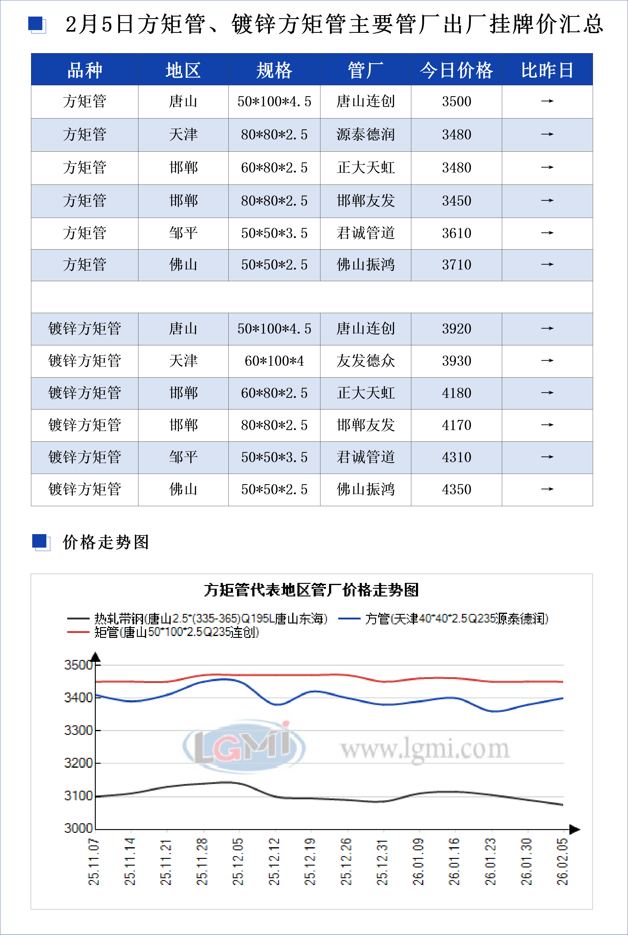 2月5日方矩管、镀锌方矩管主要管厂出厂挂牌价汇总