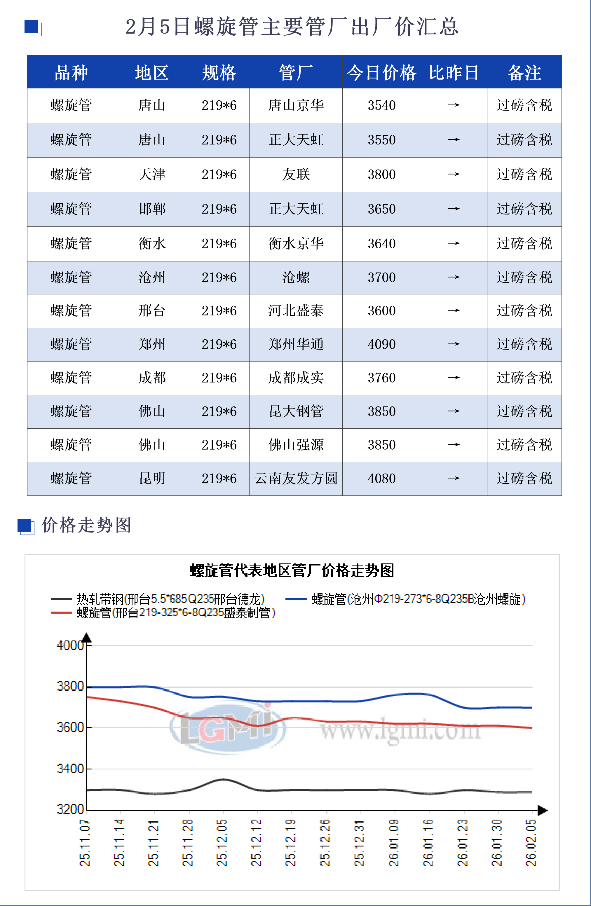 • 2月5日螺旋管主要地区管厂出厂价汇总