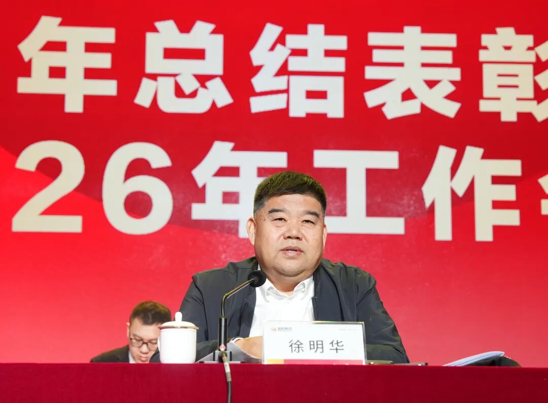 2月9日,盛阳集团召开2025年总结表彰大会暨2026年工作会议,全面总结2025年度经营发展成果,表彰先进典型、凝聚发展合力,统筹部署2026年度集团发展目标与重点工作任务。集团董事长徐明华,总裁徐博林,各中心、事业部负责人,受表彰的先进集体、先进个人以及职工代表共同参会。 大会分两个阶段有序召开。第一阶段,总裁徐博林作集团工作报告,全面总结2025年集团整体经营成效,明确强调2026年战略方向与重点任务。 总裁在报告中指出,2025年,盛阳集团聚焦主业,布局棒线材、高端合金冷轧、无缝管、光亮棒等项目,经营业绩稳健向好。各事业部深耕市场需求,以优化产品结构、深化差异化竞争为抓手,持续夯实经营根基,圆满完成年度各项核心任务。