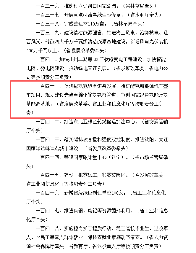 文件指出,促进绿氢氨醇全链条发展,推进醇氢新能源汽车整车项目,规划建设赤峰至锦州输氢氨醇管道,争创国家绿色氢能及氢基能源基地。同时,打造东北亚绿色船燃储运加注中心。
