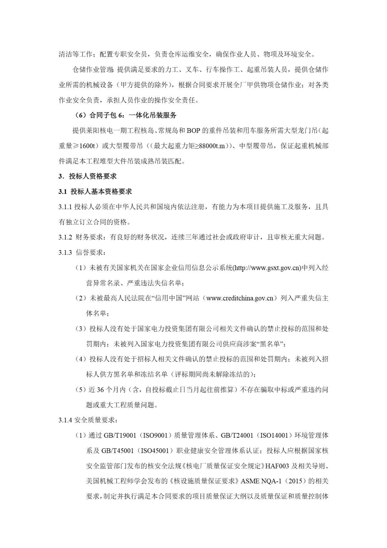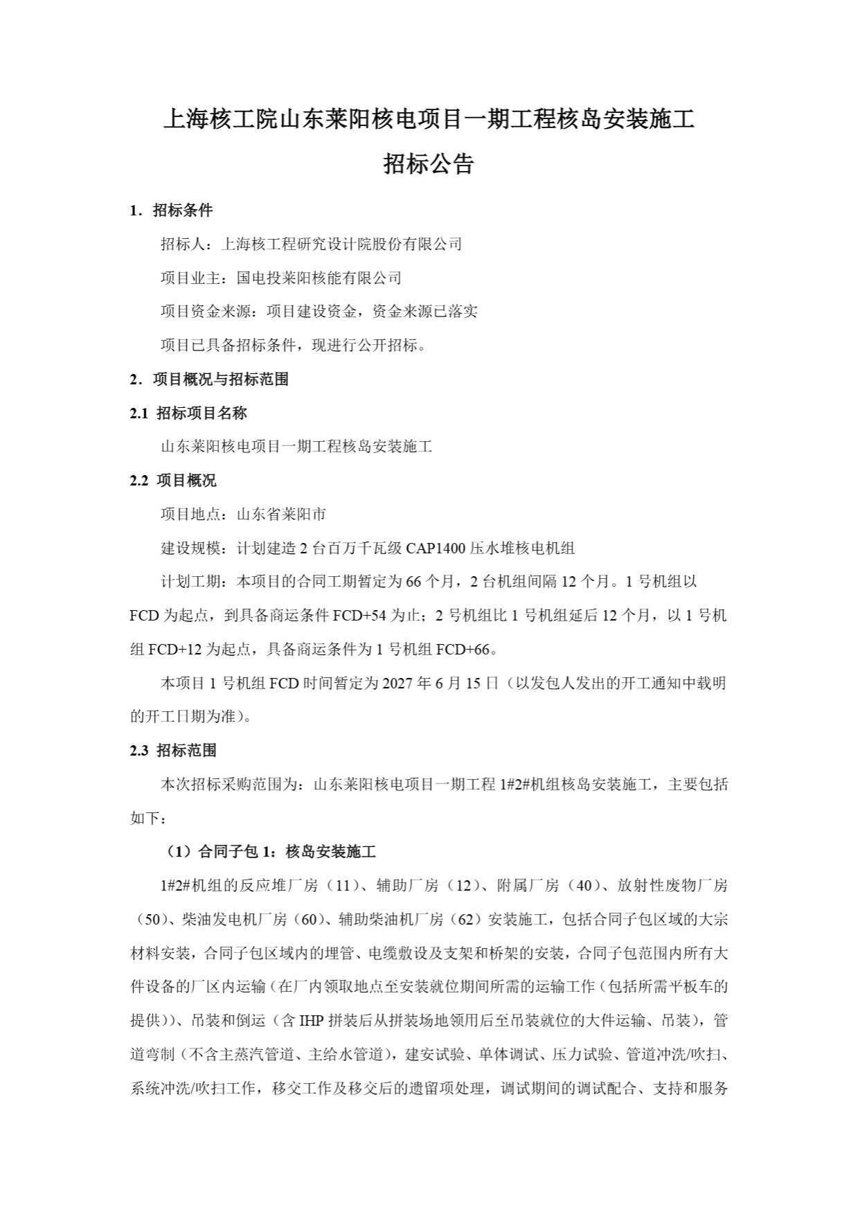 山东莱阳核电项目一期工程核岛安装施工招标