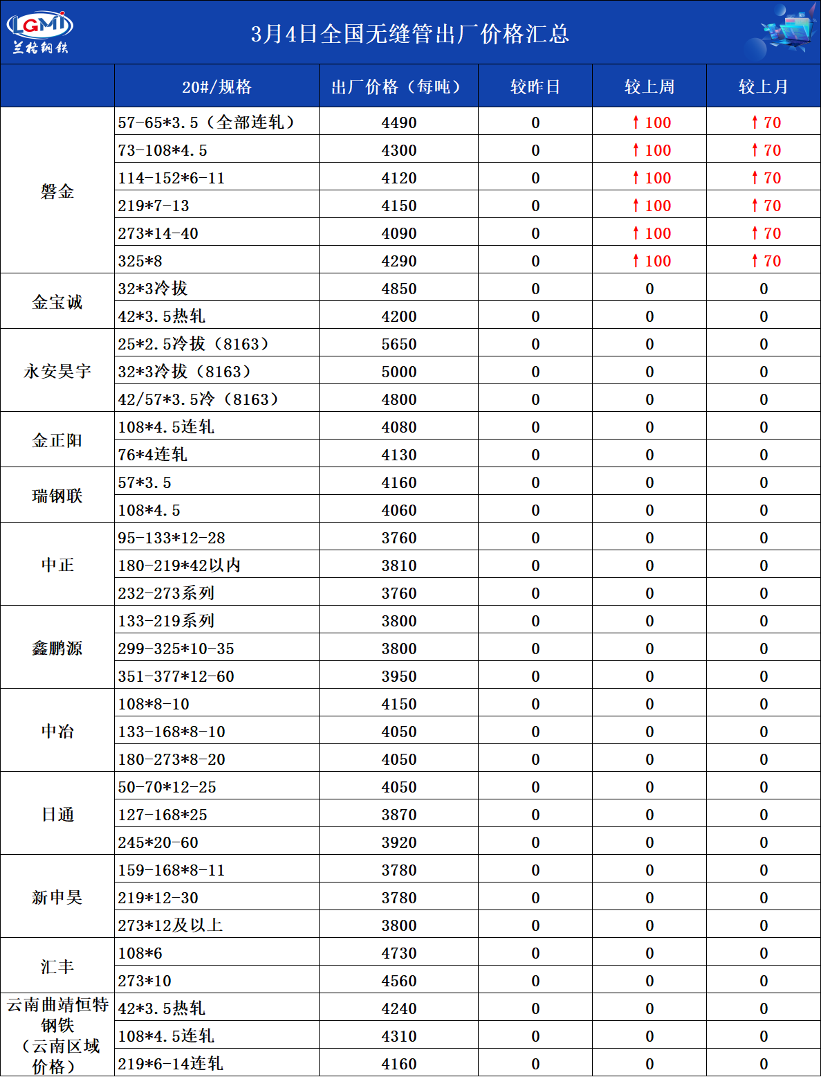 3月4日全国无缝管出厂价格汇总