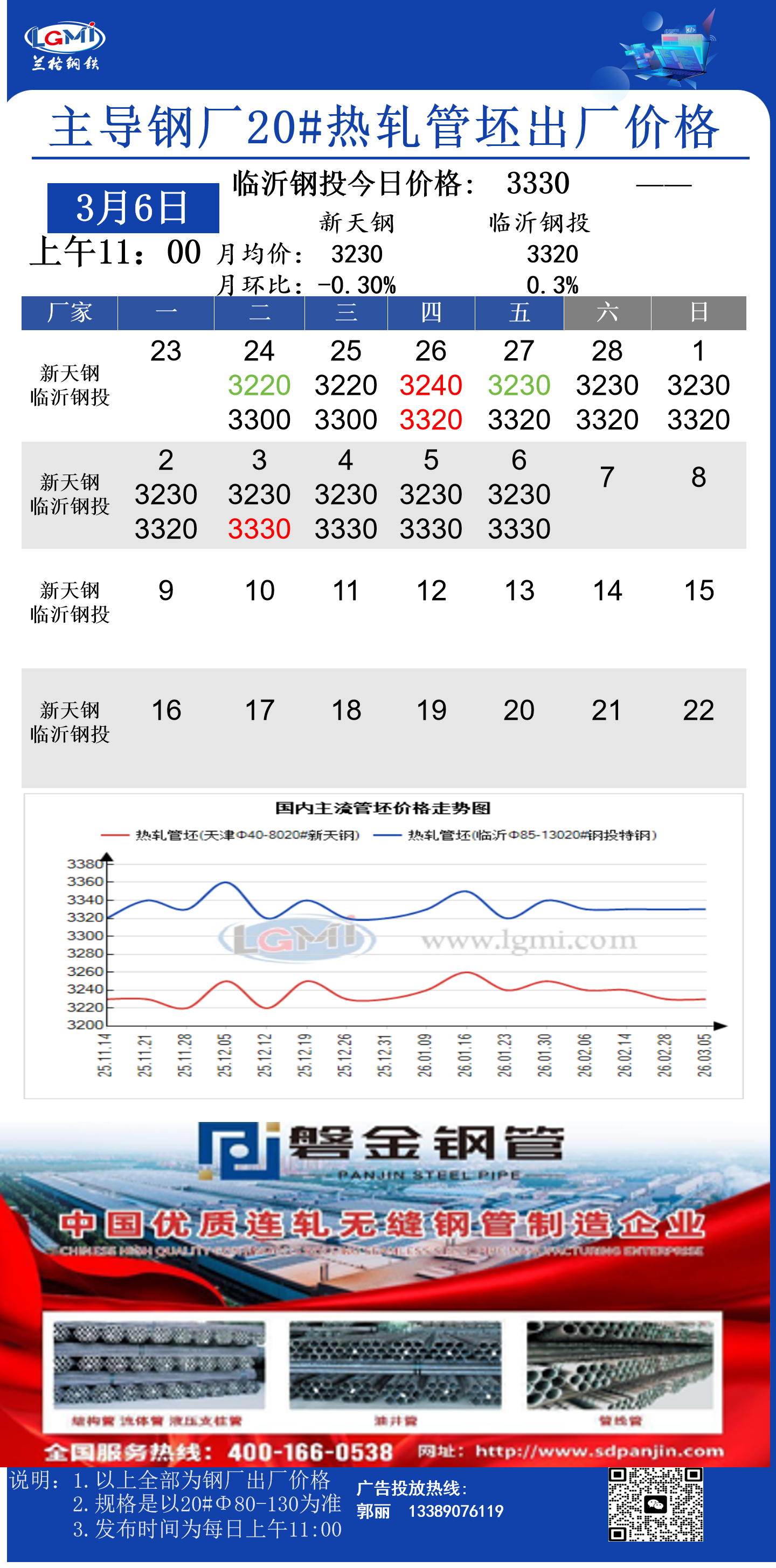 • 3月3日(11:00)主导钢厂20#热轧管坯出厂价