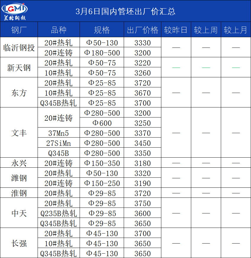 • 3月6日(11:00)主导钢厂20#热轧管坯出厂价