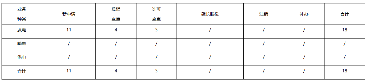 2月份,全省办理电力业务许可共18件,均为发电类电力业务许可,新申请11件,登记事项变更4件,许可变更3件。